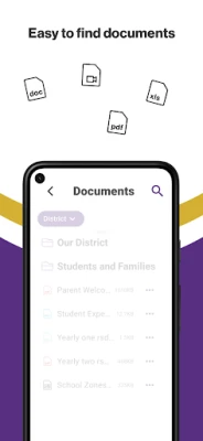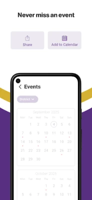 NEVER MISS AN EVENT The event section shows a list of events throughout the district. Users can add an event to their calendar to share the event with friends and family with one tap.