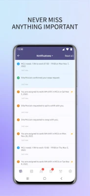 Receive notifications when there are updates to your requests, or when open shifts are posted. Get reminders for your upcoming shifts and events.
